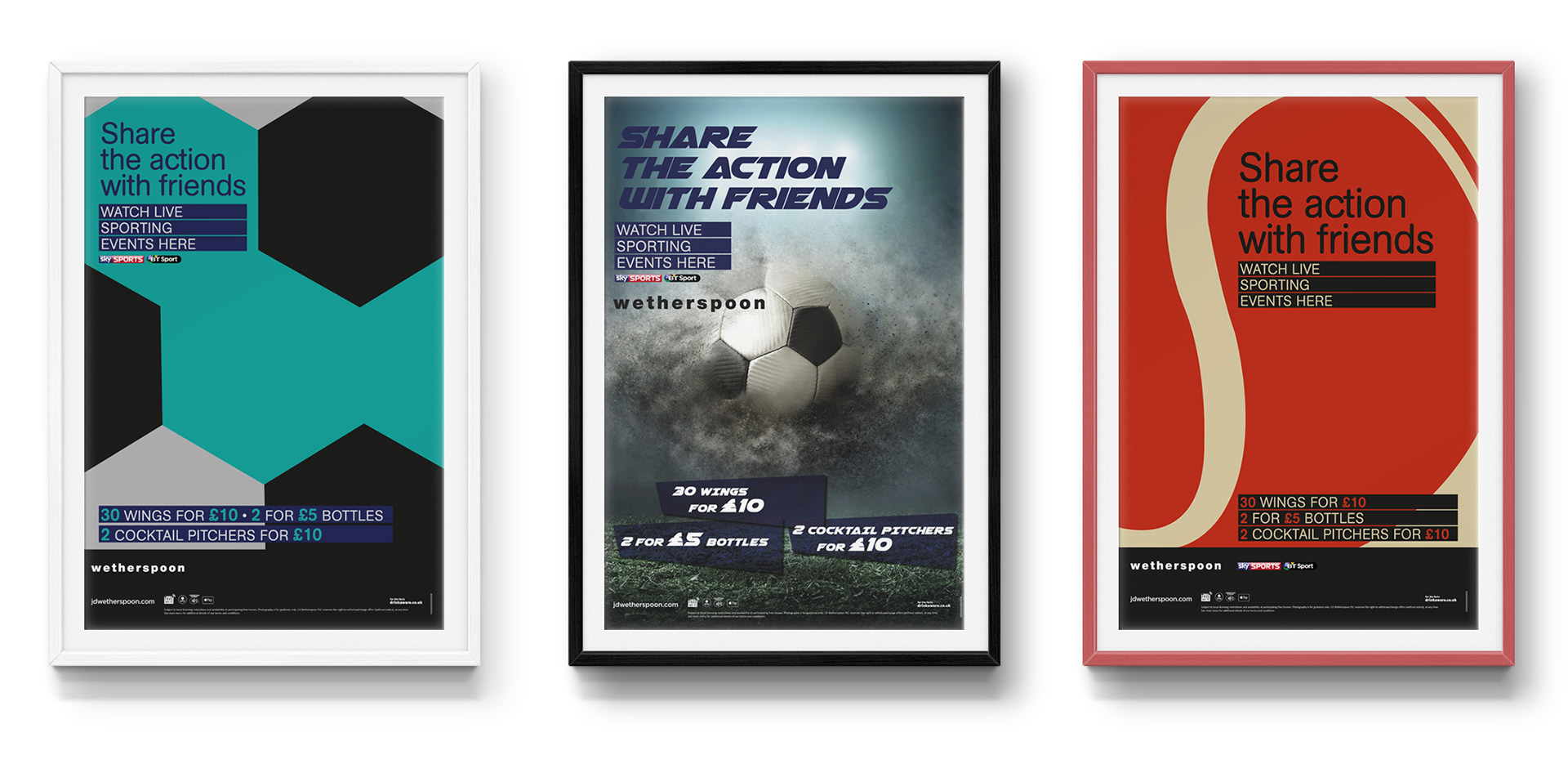 Below are page examples of the Wetherspoon News magazine which I co-designed with one other designer. The quarterly magazine is distributed to all employees and customers in Wetherspoon pubs and hotels. I continue to work on the magazine regularly in an artwork capacity. For the posters I was asked to come up with ideas for various sporting events to be shown in the pubs and a Father's Day promotion.